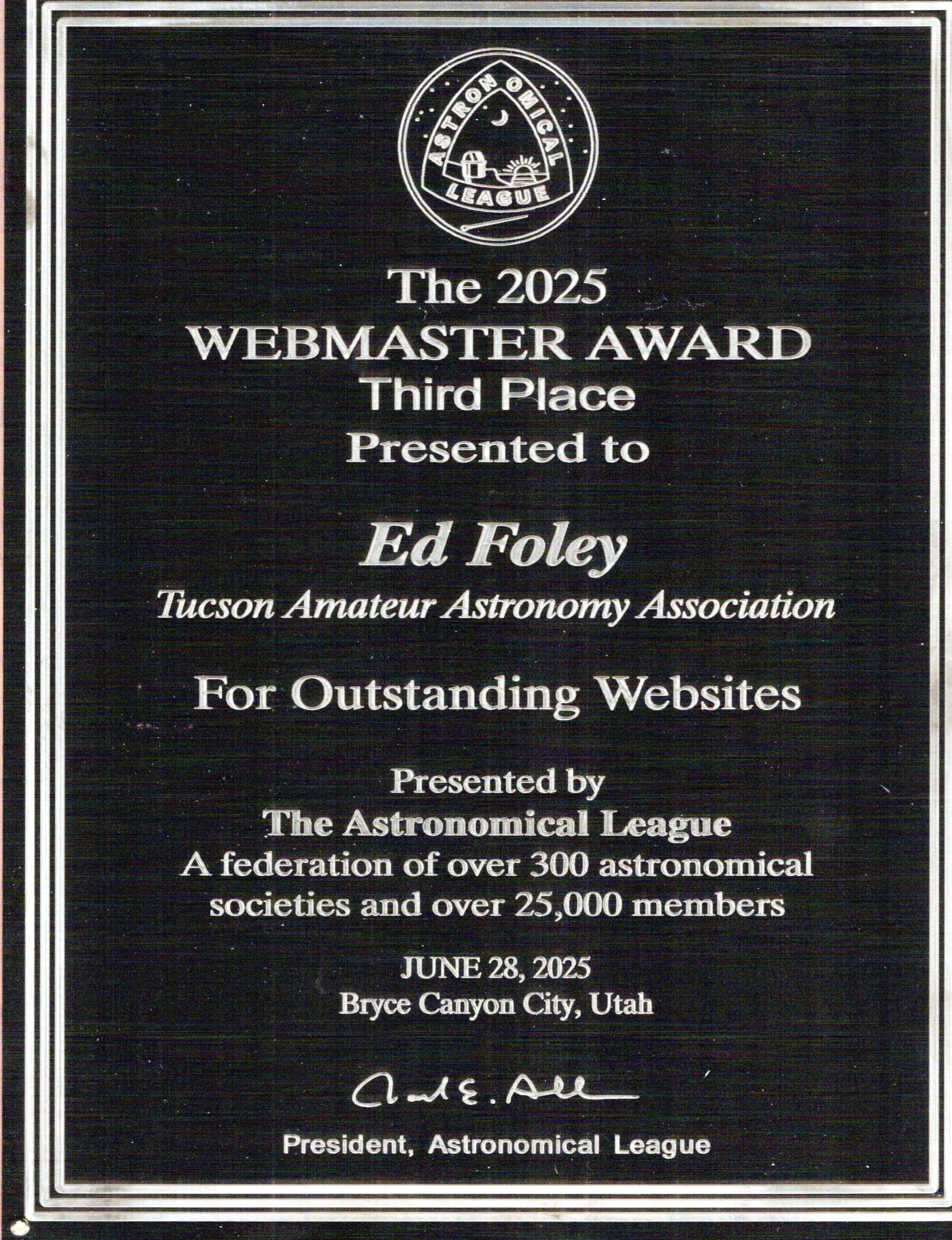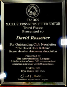 Astronomical League Awards earned – By 2025 TAAA members had earned a total of 151 awards for Outreach to the community – the second highest in the nation. We have 25 members who have earned Master awards in this category. 2024 TAAA Members earned 24 AL Awards – 2023 TAAA Members earned16 AL Awards – 2022 TAAA Members earned 38 AL Awards. In 2022 TAAA members earned the third highest number of Astronomical League Outreach awards in the nation.